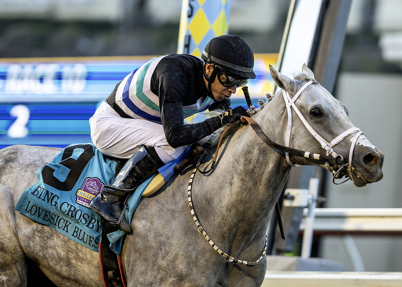 Lovesick Blues was an unlikely winner of the $402,000 Bing Crosby Stakes until the top of the stretch on Saturday. Ridden by Geovanni Franco, Lovesick Blues rallied wide through the final three furlongs, closing from sixth of nine to win by 1 3/4 lengths as an 18-1 outsider.
