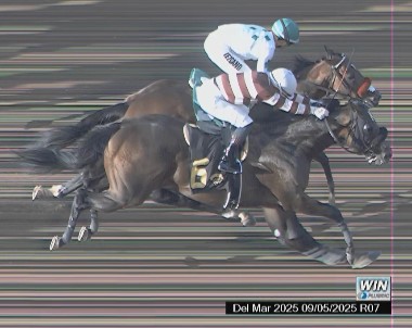 DEL MAR, Calif. (Sept. 5, 2025) – Max Ciao held off a sustained threat from Thirsty Rebel in the final quarter-mile to post a minor upset in Friday’s $101,000 I’m Smokin Stakes for 2-year-old Golden State Series-eligibles at Del Mar, giving freshman stallion Maxfield his first stakes winner.