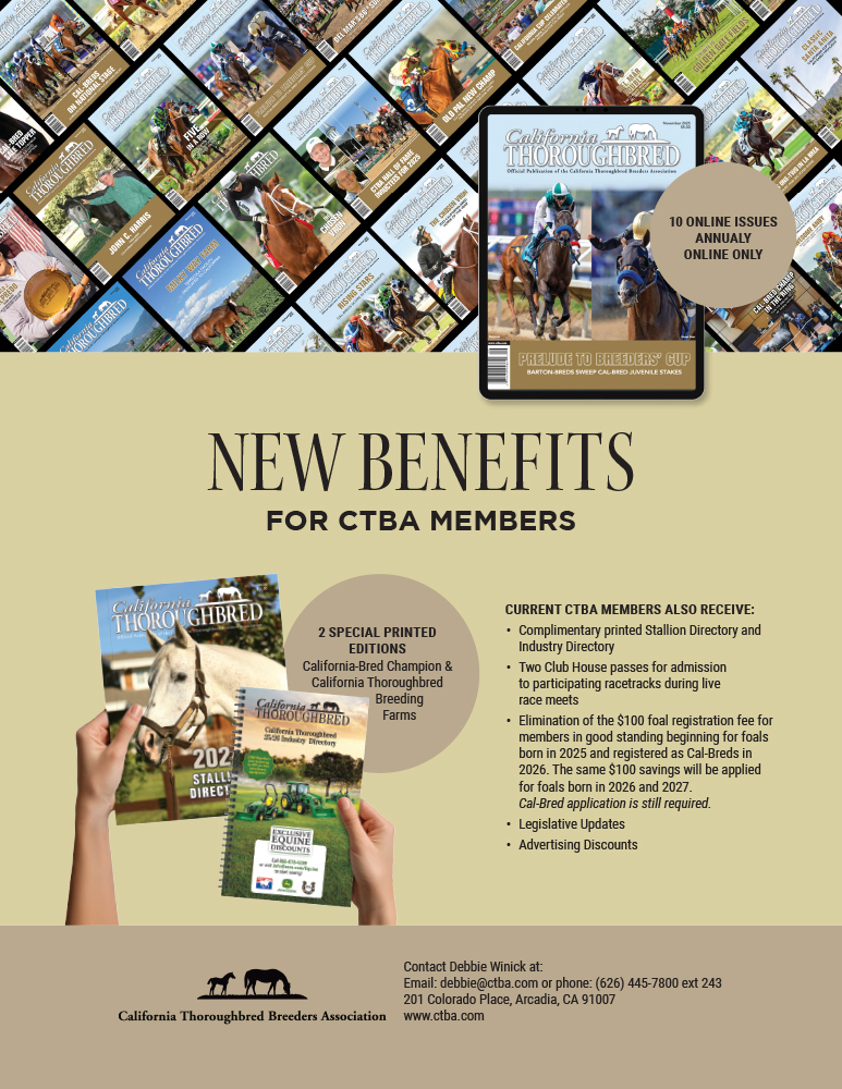 To further assist the membership of the California Thoroughbred Breeders Association (CTBA) and subscribers of its official publication, California Thoroughbred, the monthly editorial page provides readers with updates about the association’s current policies, latest news, and upcoming events in the Golden State.