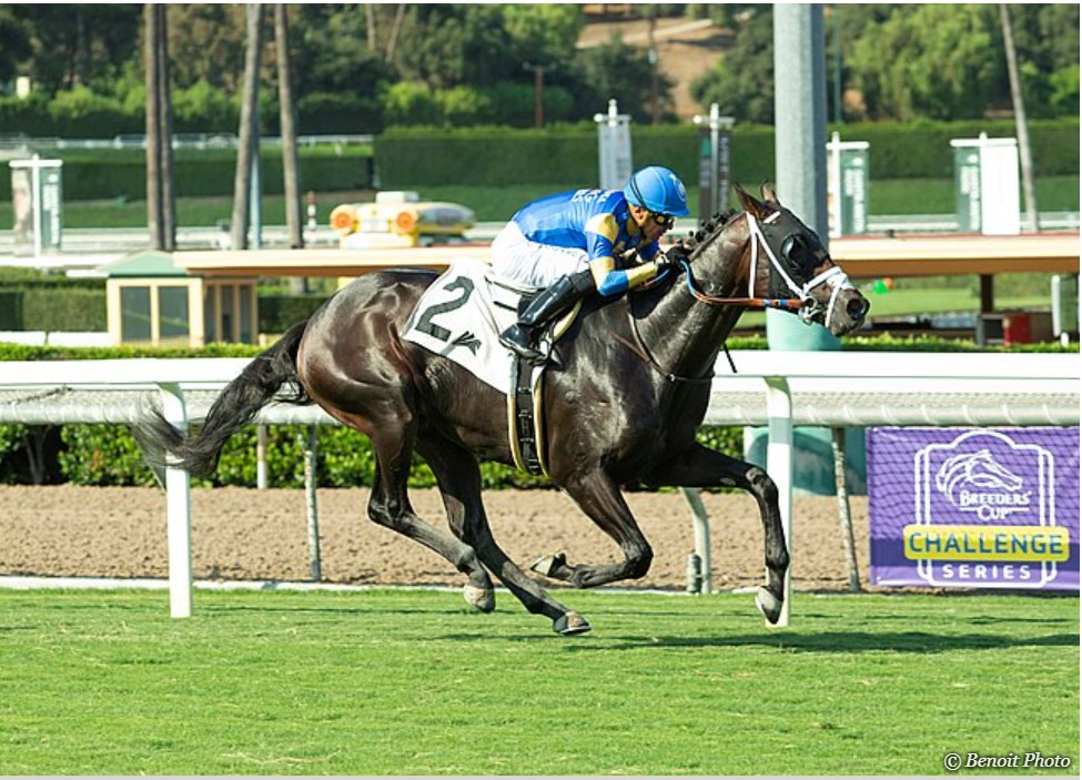 Ridden by Juan Hernandez for trainer Peter Miller, the California-bred colt took the lead at the half-mile mark of the six-furlong turf test and steadily improved his advantage to two lengths at the wire, stopping the clock in a snappy 1:08.49 while outperforming 10 rivals as the 5-2 wagering favorite.